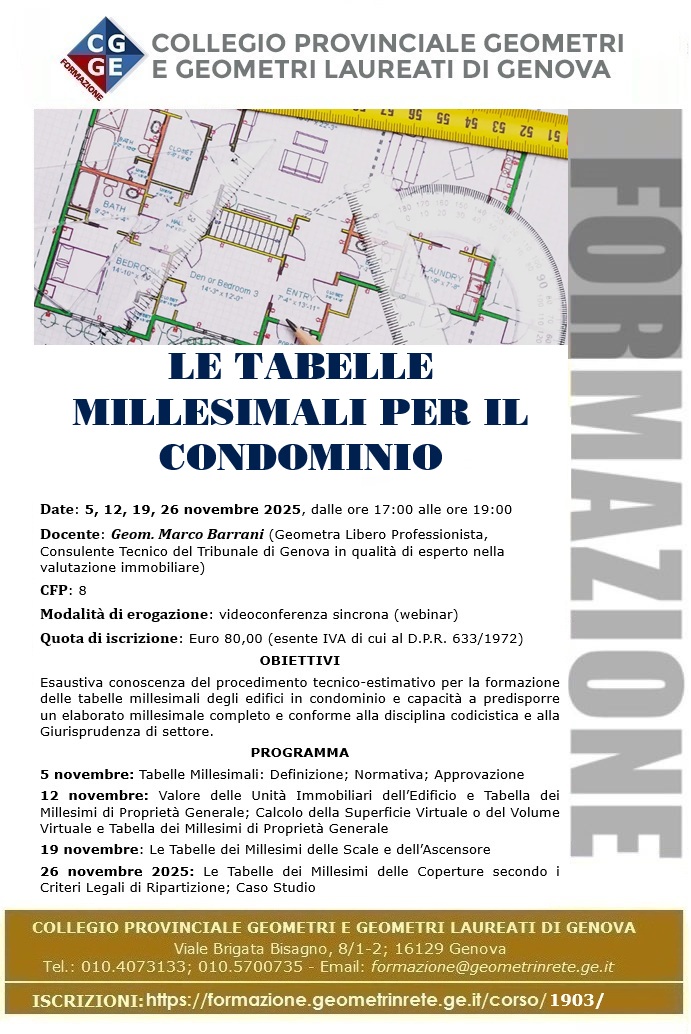 Pubblichiamo quanto ricevuto dal Collegio Geometri e Geometri Laureati di Genova in merito a Corso: “Le Tabelle Millesimali per il Condominio”